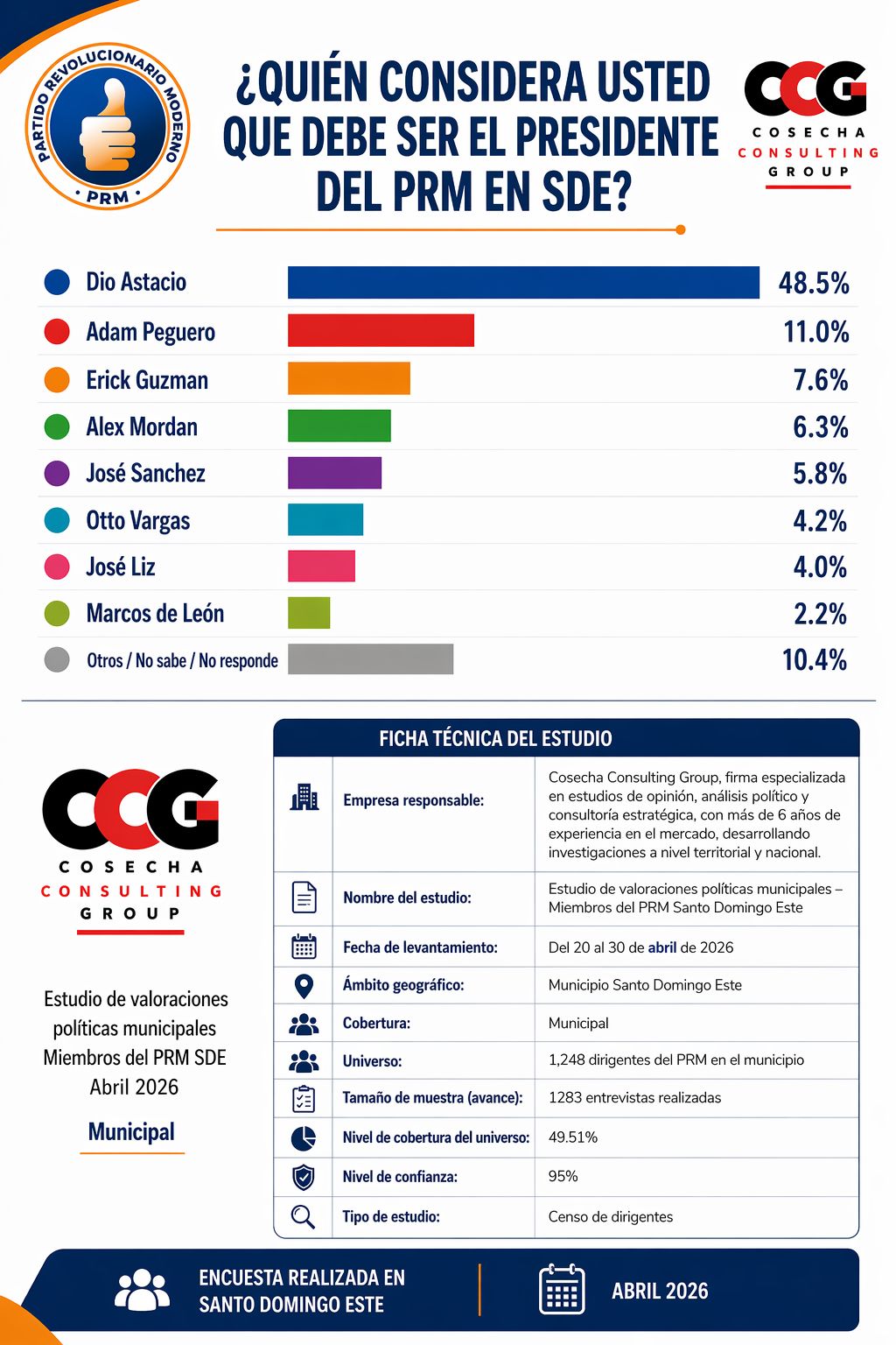 De acuerdo con los resultados de la encuesta, ante la pregunta “¿Quién considera usted debe ser el presidente del PRM en Santo Domingo Este?”, Dio Astacio obtuvo un 48.5 % de respaldo, colocándose ampliamente por encima de los demás aspirantes evaluados.