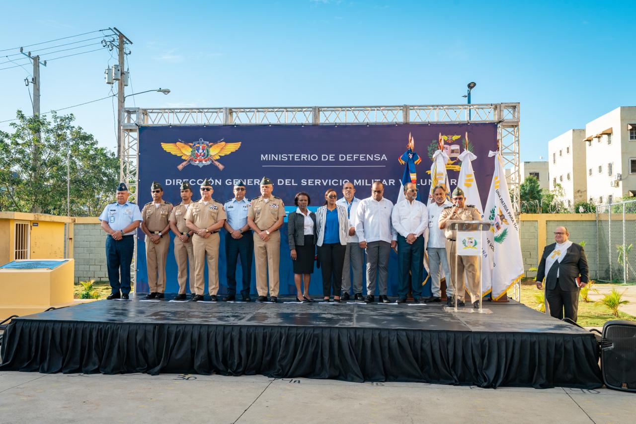 La actividad fue encabezada por el ministro de Defensa, teniente general Carlos Antonio Fernández Onofre, ERD, quien estuvo acompañado por el general de brigada piloto Rafael Acosta Sena, FARD, director del Servicio Militar Voluntario, y por la licenciada Rut de los Santos, directora del Politécnico Evangelina Santos Bergés.